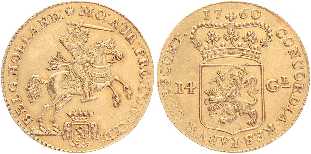 Gouden rijder van 14 gulden 1760. Delm. 782; CNM 2.28.47; HPM 19 [9,98 gram]. Ruim zeer fraai.