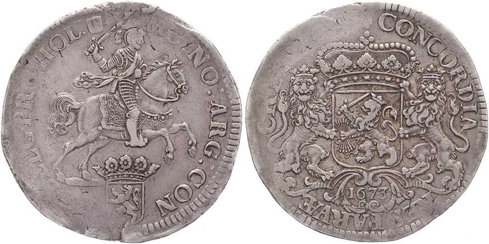 Zilveren rijder of dukaton 1673. Delm. 1014; CNM 2.28.84. Deels zwak geslagen, onregelmatige rand. Fraai.