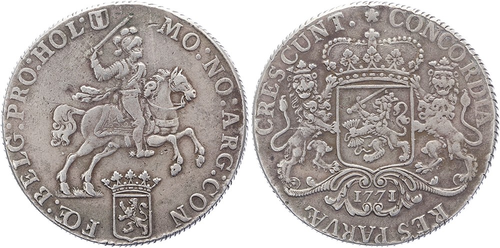 Zilveren rijder of dukaton 1771. Delm. 1014; CNM 2.28.84. Vrijwel zeer fraai. Uit onze veiling 1, september 1995, kavel 27