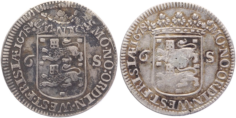 Lot (2) Scheepjesschelling 1678. CNM 2.15.8; HPM 81. Twee varianten! Zeer fraai.