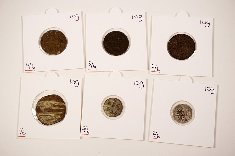 Lot (6) leuk lotje Zeeland bestaande uit oord 1663, bezemstuiver 1763 alsmede 1763 incusum!, duit 1754, 1788 en 1793. Fraai en beter.