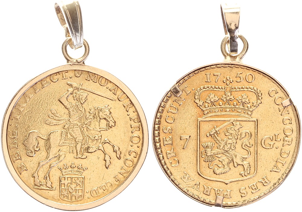 ½ Gouden rijder of 7 gulden 1750. Delm. 971; CNM 2.43.38; HPM 32 [5,76 gram]. Geklemd in rand met draagoog. Zeer fraai.