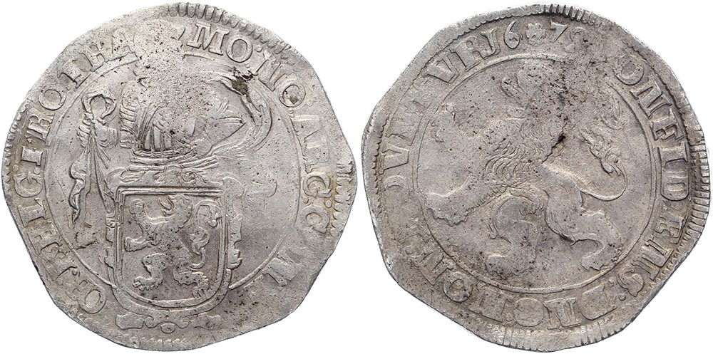 Leeuwendaalder 1679. Afwijkend omschrift voorzijde: MO: NO: ARG: CONF – Œ: BELG: PRO: TRA Vgl. Delm. 856b; vgl. CNM 2.36.65; vgl. HPM 37. Fraai / zeer fraai. Ex veiling 23 Laurens Schulman, november 1999, kavel 801