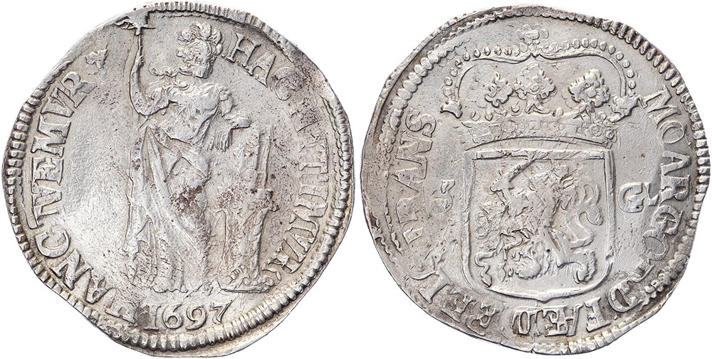 3 Gulden 1697, mmt. links van de vrijheidshoed. Omschrift keerzijde eindigt op TRANS Delm. 1152; CNM 2.38.87; HMP 53. Bijna zeer fraai.