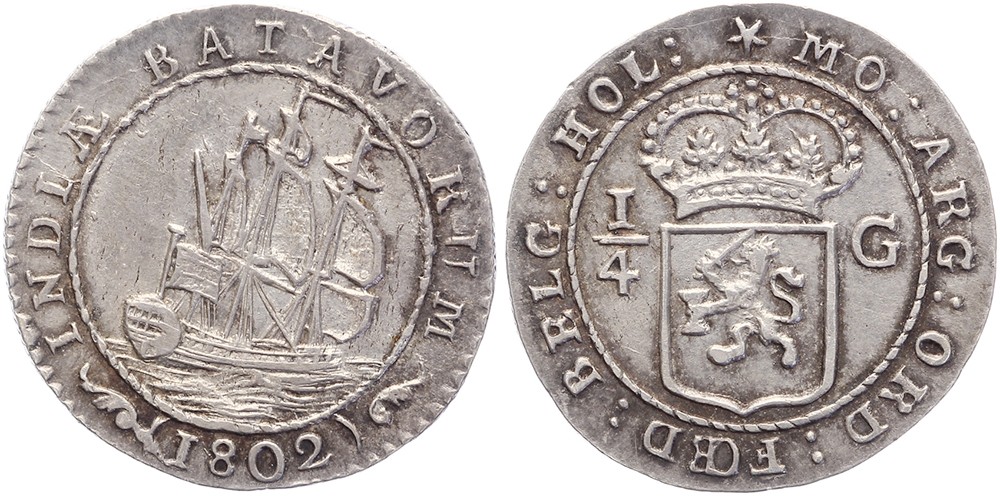 1/4 Scheepjesgulden 1802. Scholten 492e. Ruim zeer fraai.