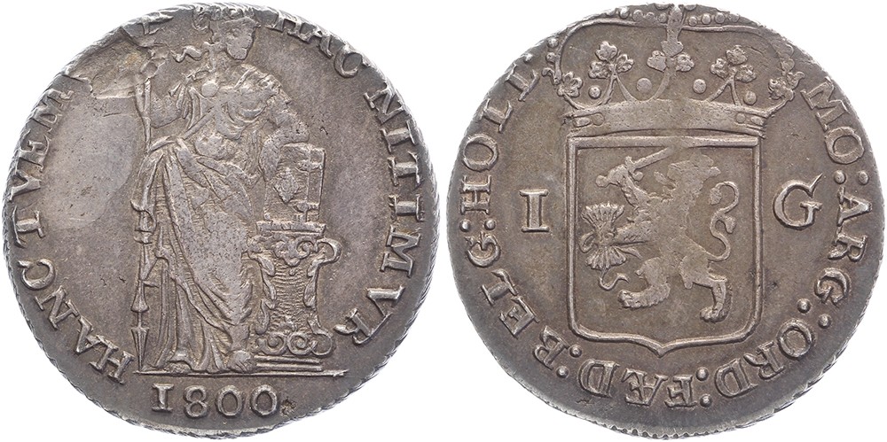 Holland. 1 Gulden 1800. Sch. 93. Vz. iets beschadigd muntplaatje, overigens fraai / zeer fraai.