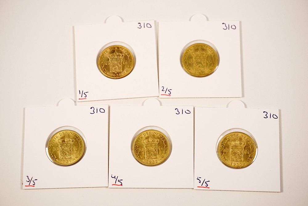 Lot (5) 10 Gulden 1925, 26, 27, 32 en 1933 Sch. 749 t/m 753. Complete serie! Prachtig