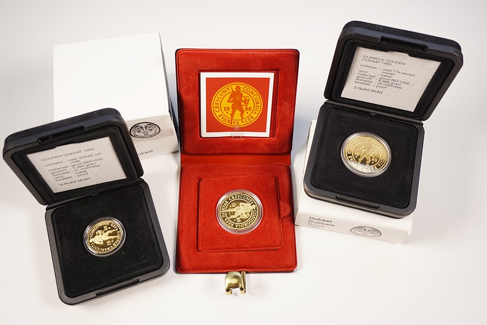 Lot (6) Gouden dukaat 1993, 1994 en 1995. Dubbele gouden dukaat 1988, 1989 en 1991. Proof in cassette.