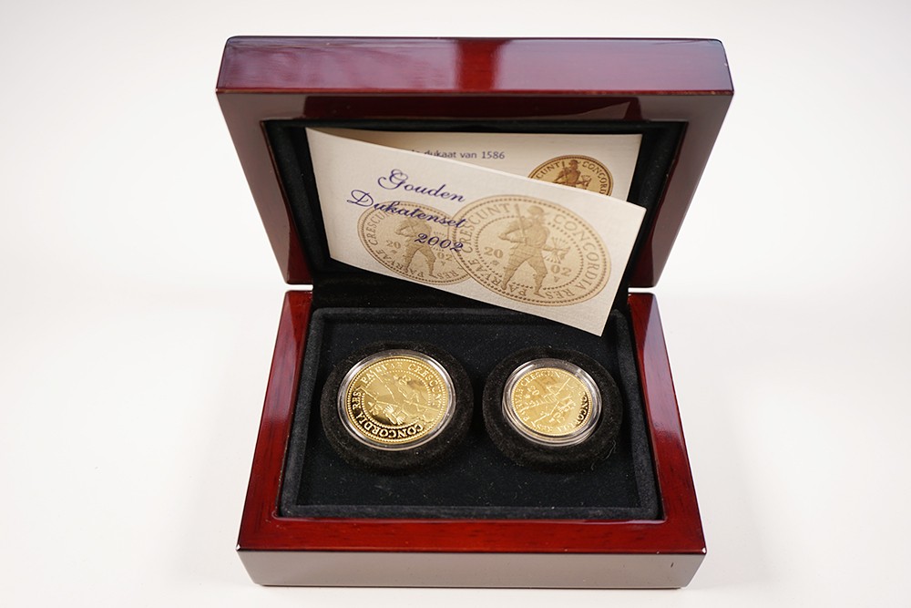 Enkele + dubbele gouden dukaat 2002. Prooflike in houten KNM-doosje.