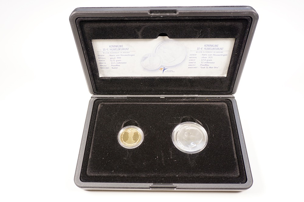 Gouden + zilveren 10 euro 2002 huwelijk Willem-Alexander & Máxima. Prooflike in KNM-cassette.