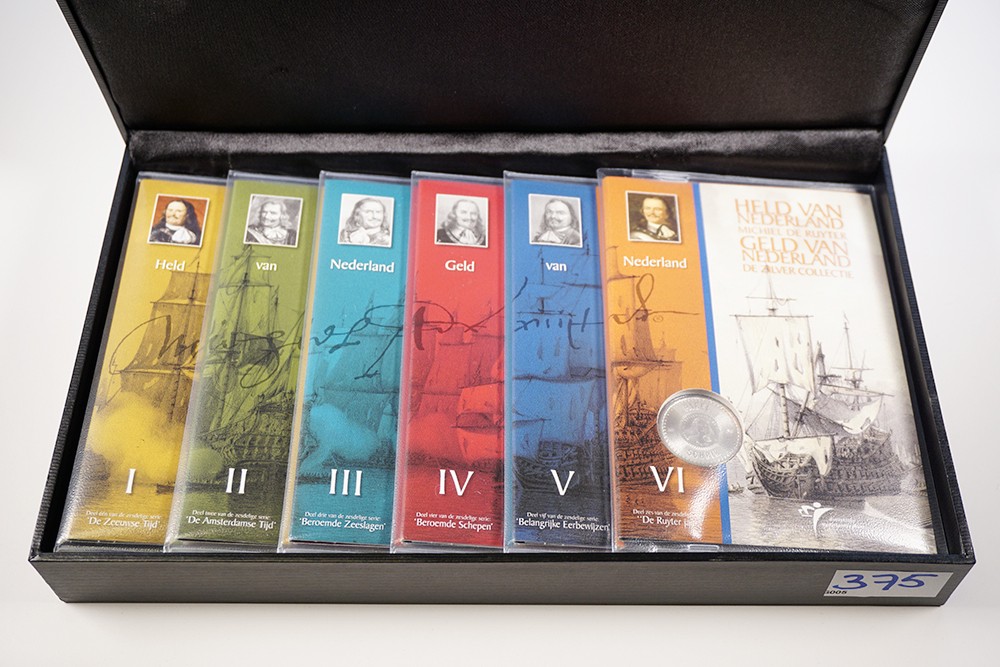 Fraaie zwarte cassette ‘Held van Nederland, Michiel de Ruyter, Geld van Nederland, de Zilver Collectie’, met zes FDC-sets 2007 (Alm. 32-37).