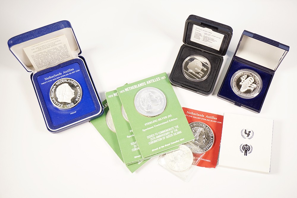 Nederland Overzee. Doos met ca. 30 zilveren herdenkingsmunten. Veel proof.