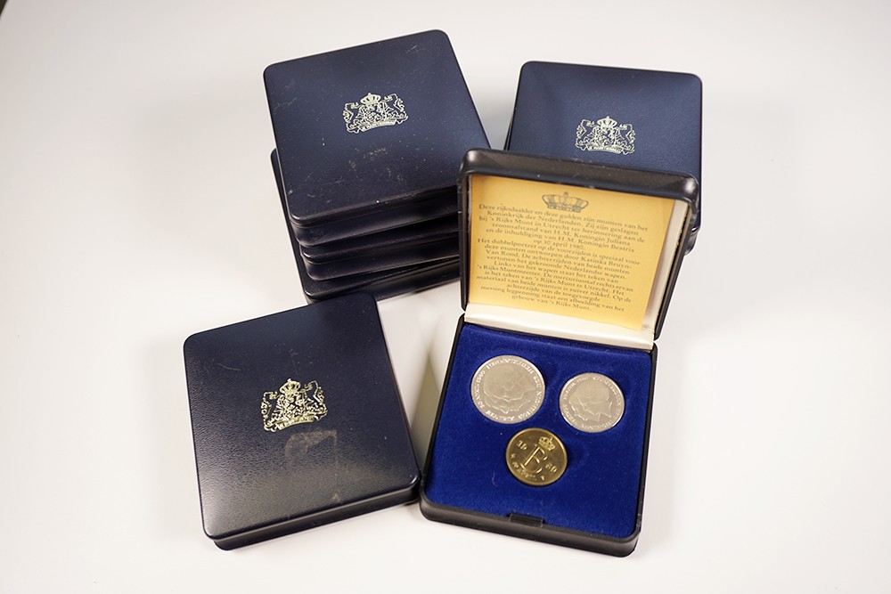 Kartonnen doos met 44 x inhuldigingset 1980 [1 + 2 ½ gld. dubbelportret].
