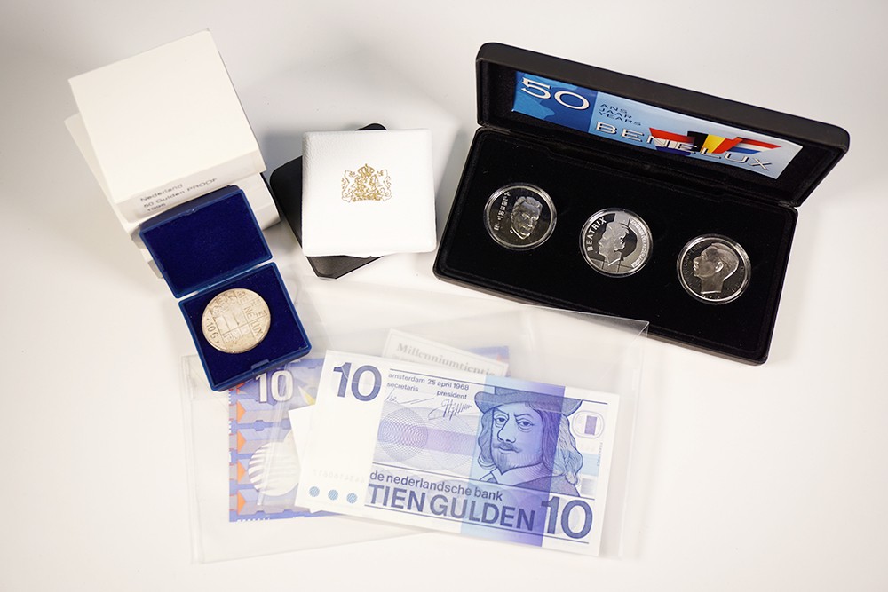 Doos moderne herdenkingsmunten van Nederland, o.a. 19x 50 gld en 10x zilveren tientje.