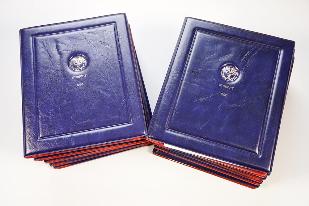 Theelichtendoos met 39 blauwe proofsets 1983-1995.