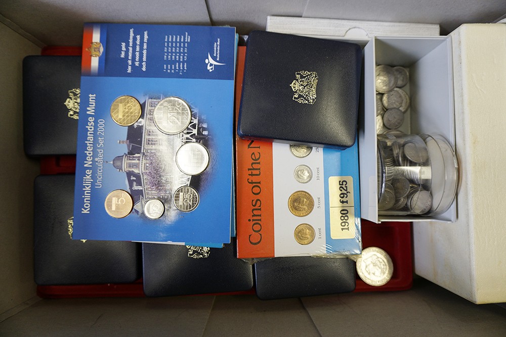Doos met 115 x rijksdaalder 1959-1966, 5x zilveren tientje 1970, 6x zilveren tientje 1973. Toegevoegd: mooi nominaal, centen, stuivers, dubbeltjes, kwartjes etc.