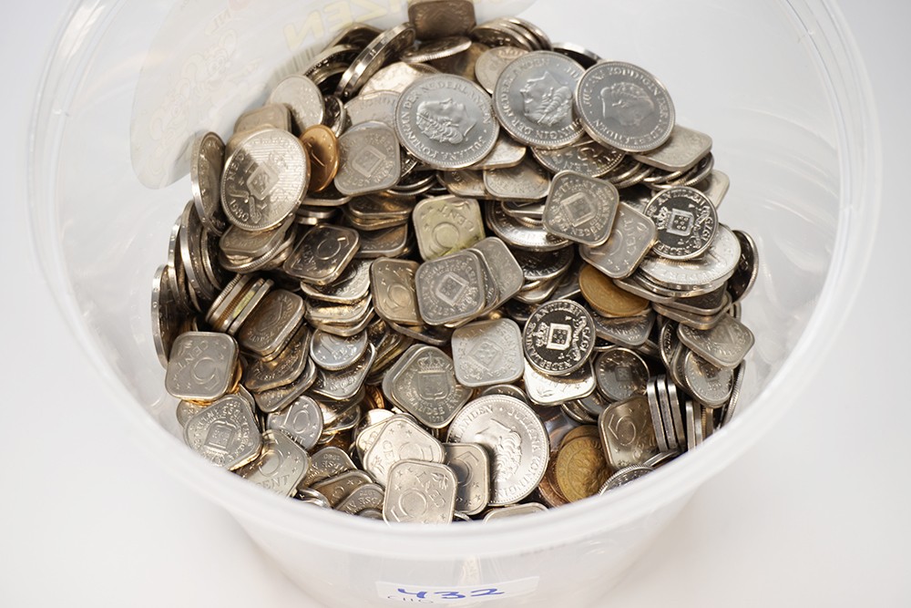 Transparant tonnetje pasgeld Nederlandse Antillen 1954-1980, w.o. vroeg brons in hoge kwaliteit. Ruim 6 kg.