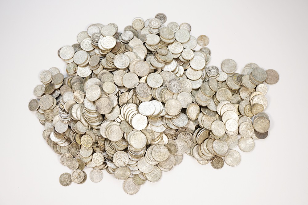 Doos met bijna 2 kilo dubbeltjes en kwartjes van Nederlands Indië. Gehalte 720/1000.