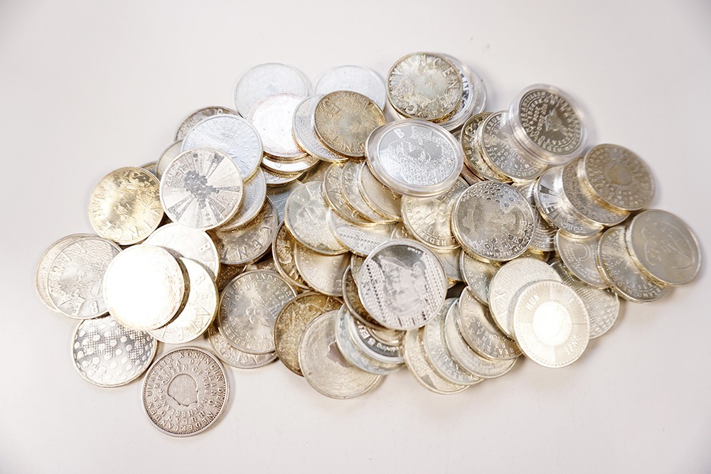 Sigarenblikje met 81 x € 5 herdenkingsmunten, zilver en/of verzilverd. Nominaal: € 405