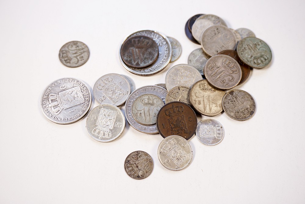Blikje ‘Ritmeester’ met diverse munten Willem I (36), van ½ cent t/m gulden. Meest mindere kwaliteiten.