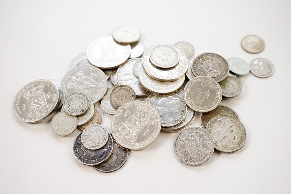 ‘Panter’sigarenblikje (53) met dubbeltjes, kwartjes, ½ guldens en guldens Wilhelmina jeugdportret, inhuldigingstype en hermelijnen mantel. Diverse kwaliteiten.