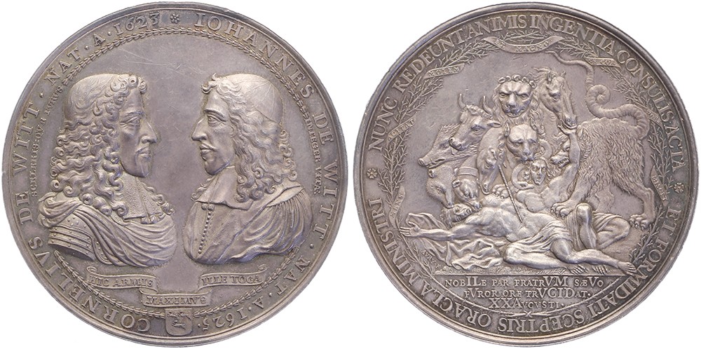 1672 Moord op Johannes & Cornelis de Witt. Borstbeelden van de gebroeders elkaar aankijkend. / Negenkoppig monster verscheurt de broers. Jaartal in chronogram in afsnede. “AVRY F” links onder langs de binnenrand. AR 71,8 [98,69 gr.]. Vgl. vL III-87.1; KPK 1073. Donker goudgeel patina, minieme krasjes boven de hoofden voorzijde. Prachtig / FDC.