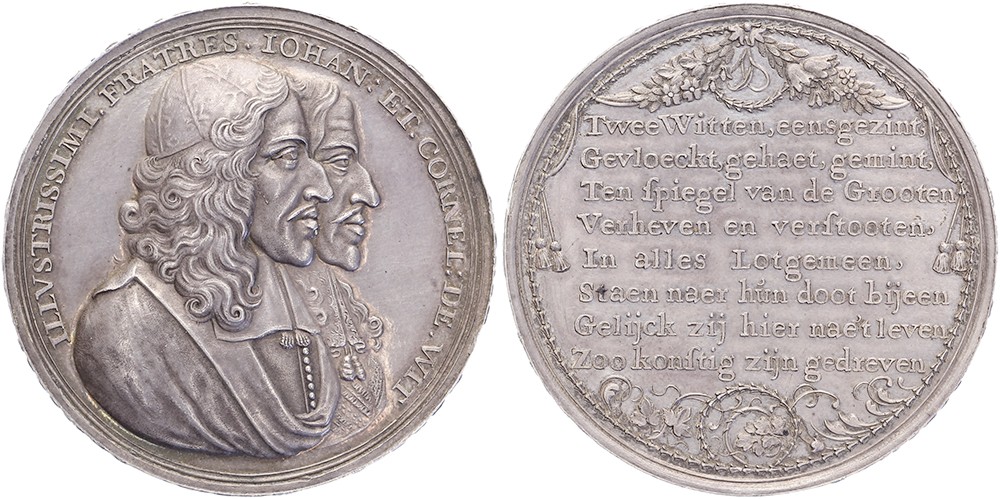 1672 Moord op Johannes & Cornelis de Witt. Dubbelportret naar rechts. / Achtregelig gedicht. Randschrift: * VIOLENTA MORTE DELETI HAGÆ COMITIS 20 AVG: AO• 1672 AR 48,5 [41,98 gr.]. vL III-87.3; KPK 1081. Egaal patina. Prachtig.