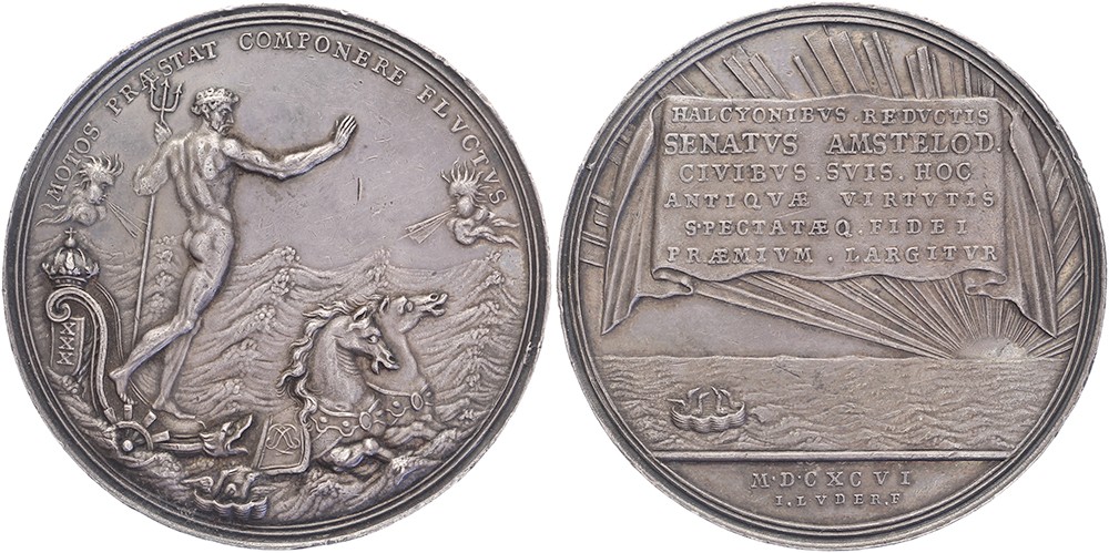 1696 Aansprekersoproer te Amsterdam. Neptunus met drietand op zeewagen bestrijdt de wind. / Nest met ijsvogels op kalme zee met ondergaande zon. De grote penning voor de officieren. AR 58,2 [78,04 gr.]. Vgl. vL IV-161.1; DPR II-2425d; KPK 1821. Jan Luder. Vrijwel prachtig.