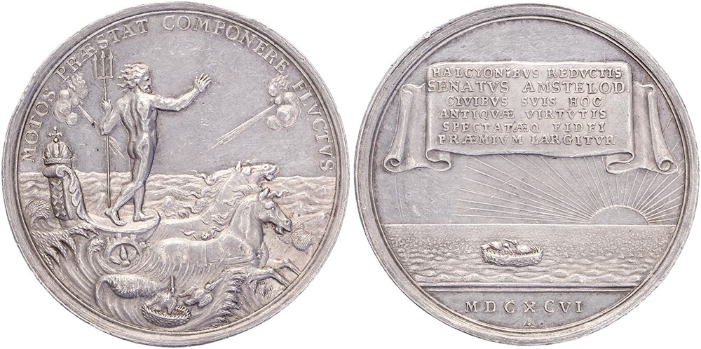 1696 Aansprekersoproer te Amsterdam. Neptunus met drietand op zeewagen bestrijdt de wind. / Nest met ijsvogels op kalme zee met ondergaande zon. Ingeslagen ‘A’ onder jaartal. De middelgrote penning voor de onder-officieren. AR 49,8 [48,16 gr.]. Vgl. vL IV-161.2. R. Arondeaux. Zeer fraai / prachtig.