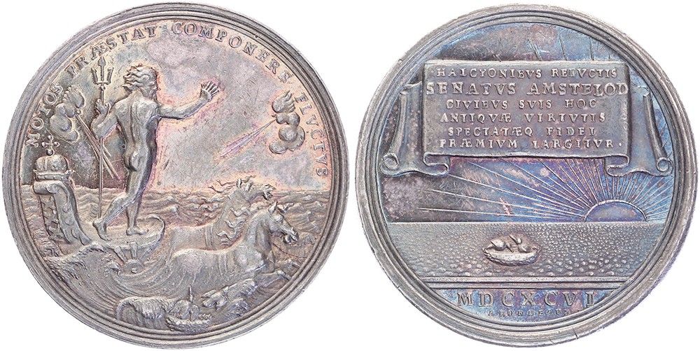 1696 Aansprekersoproer te Amsterdam. Neptunus met drietand op zeewagen bestrijdt de wind. / Nest met ijsvogels op kalme zee met ondergaande zon. De kleine penning voor de schutters. AR 39,2 [25,13 gr.]. Vgl. vL IV-161.3. R. Arondeaux. Prachtig.