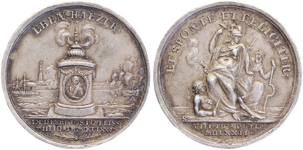 1772 Vlissingen, 2e eeuwfeest bevrijding. Versierde zuil met borstbeeld Willem van Oranje in medaillon. Op de achtergrond gezicht op Vlissingen. / Staande Libertas weert het Geweld; liggende Bijgeloof. AR 32 [12,23 gr.]. VvL 464; KPK 3243. J.H. Schepp. Zeer fraai.