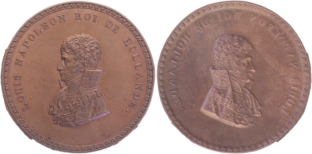 (1806) Eénzijdig koperplaatje met borstbeeld Lodewijk Napoleon, in koninklijke outfit, naar links. Omschrift: LOUIS NAPOLEON ROI DE HOLLANDE. Æ 50. Nahuys II pl. I.3. Enige nieuwglans en zeldzaam. Prachtig / FDC.