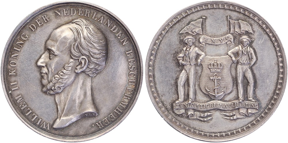 (1841) Willem II, beschermheer Koninklijke Nederlandsche Yacht Club. Buste koning Willem II naar links. / Wapen KNYC gehouden door twee leden in kostuum. Randinscriptie: DE METEOROLOGISCHE COMMISSIE AAN KAPT. P.J. DIRKSEN AR 45 [52,16 gr.]. Dirks 583. D. van der Kellen. Patina. Prachtig.