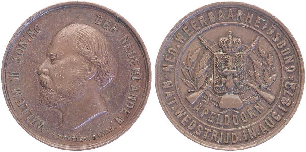 1872 uit 1870. Apeldoorn. Nationale wedstrijd Nederlandsche Weerbaarheidsbond. Hoofd Willem III naar links. / Gekroond wapen van Apeldoorn op twee gekruiste buksen. Æ 32,5. Zw. 248. S. de Vries. Zeer fraai. N.B. Alhoewel de penning reeds in 1870 werd geslagen, is door het uitbreken van de Frans-Duitse oorlog de wedstrijd uitgesteld. In 1871 was er een heersende cholera-epidemie. In 1872 kon de wedstrijd uiteindelijk plaatsvinden.