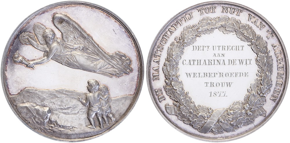 (± 1875) Beloningspenning Mij. Tot Nut v.h. Algemeen. Twee naar links wandelende kinderen in desolaat landschap. Daarboven zwevende Genius met lauwerkrans en brandende toorts. / Inscriptieruimte binnen krans. Op naam van: ‘DEPT. UTRECHT AAN CATHARINA DE WIT WELBEPROEFDE TROUW 1877’ AR 51 [48,12 gram]. Zw. 516. J. Elion. In palmhouten schroefdoosje. Prachtig.