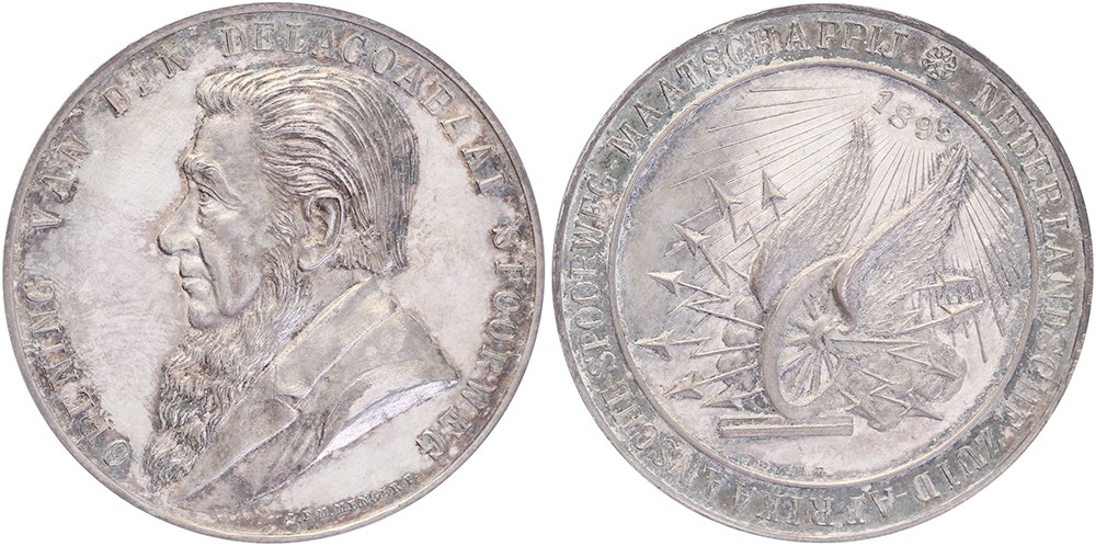1895 Zuid-Afrika. Opening Delagobaai spoorweg. Buste Paul Kruger naar links. / Gevleugeld wiel op rails. AR 45 [35,44 gr.]. Zw. 1181; Moyaux 52. J.P.M. Menger. Schaars in zilver. Patina. Prachtig / FDC.