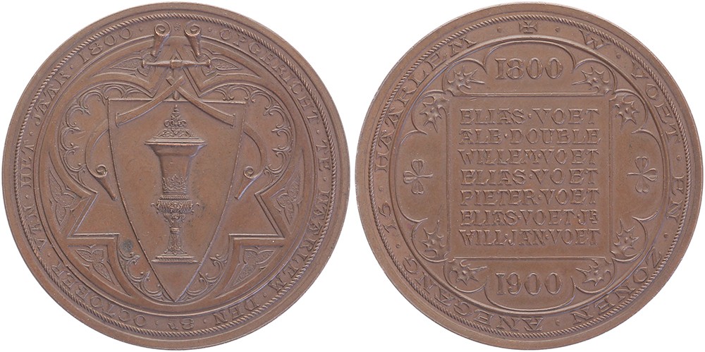 1900 Haarlem. Eeuwfeest W. Voet & Zn., zilversmeden. Geornamenteerd schild met bokaal. / Tableau met namen firmanten. Æ 50. Zw. 115. E. Voet jr. Niet vaak voorkomend. Spotje vz., prachtig.