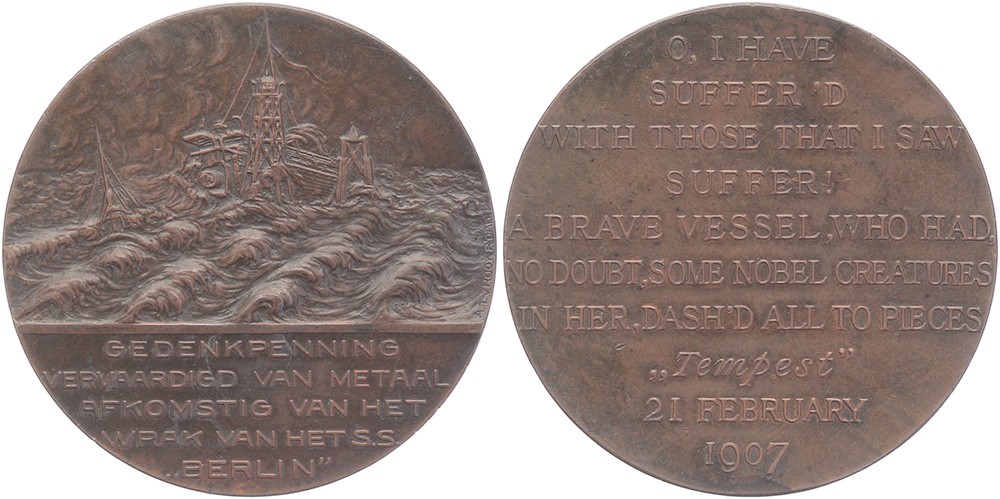 1907 Ondergang S.S. Berlin, dankpenning. Het op de pier bij Hoek van Holland gestrande schip. / Tienregelig Engels opschrift. Æ 46,8. KB I-760; Zw. 718. (J.J. van Goor). Niet vaak voorkomend. Zeer fraai / prachtig. N.B. Gedistribueerd en gestempeld door A.T. van Rooy, Rotterdam; geslagen van het koper van het wrak.