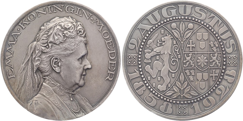 1928 Koningin-moeder Emma 70 jaar. Borstbeeld Emma naar rechts. / Wapen van Nederland en Waldeck-Pyrmont. Randinscriptie: J.F. DUWAER NR. 44 AR 60 [65,40 gr.]. KB III-216. J.J. van Goor. Prachtig.