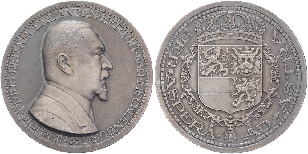 1930 Prins Hendrik. Borstbeeld Hendrik naar rechts. / Gekroond wapenschild omgeven door ordeketen en kruis. AR 60 [89,09 gr.]. KB III-425. J.J. van Goor. Enige beschadigingen op voorhoofd. Zeer fraai / prachtig.