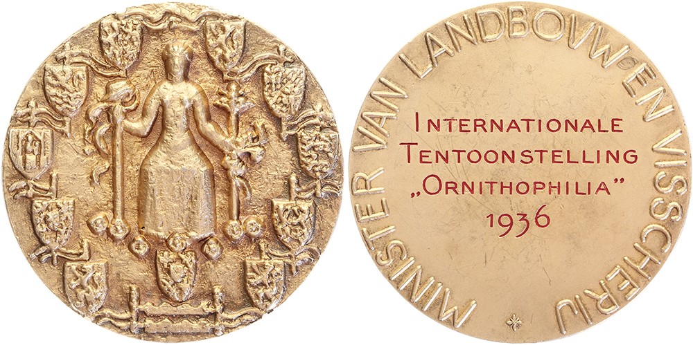 (1930) Erepenning Minister van Landbouw en Visscherij. Staande Nederlandse maagd in Hollandse tuin, omgeven door elf provinciewapens. / Inscriptieruimte binnen omschrift. Op naam van: INTERNATIONALE TENTOONSTELLING ORNITHOPHILIA 1936. Æ verguld 63. (Jan Bronner). Prachtig. N.B. Jan Bronner heeft slechts drie penningen vervaardigd; voorgaande met diverse ministeries, 300 jaar universiteit Amsterdam (1932) en Vincent van Gogh (1953).