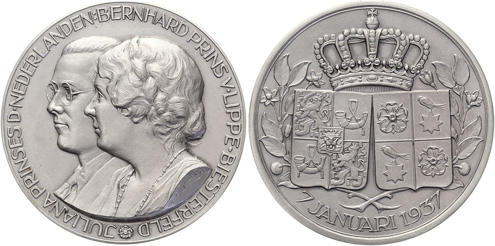 1937 Huwelijk prinses Juliana & prins Bernhard. Dubbelportret naar links. / Twee wapenschilden onder koningskroon. AR 60,2 [72,26 gr.]. KB V-1074. J.J. van Goor. Prachtig / FDC.