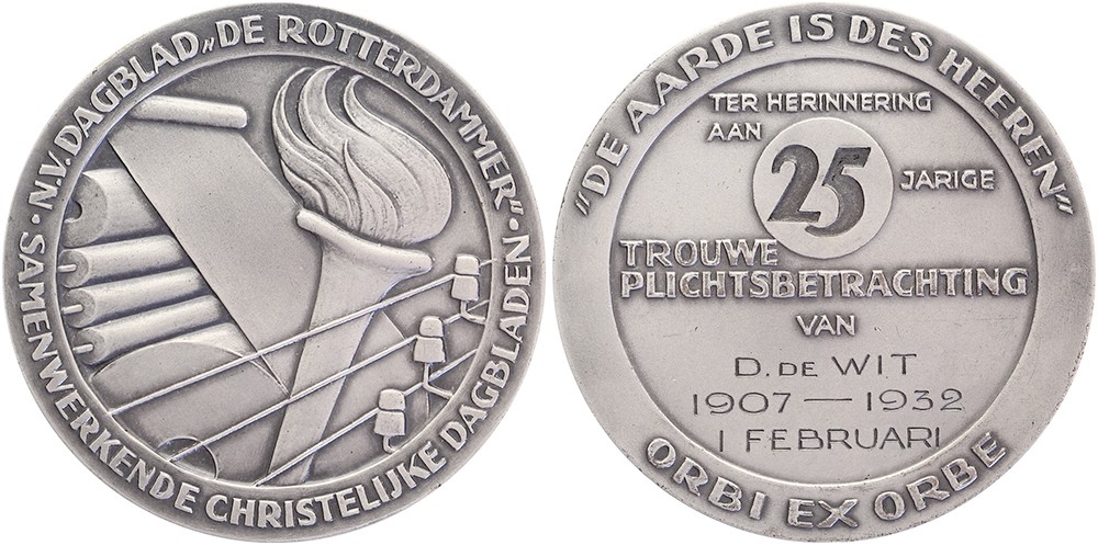 (1938) Beloningspenning dagblad ‘De Rotterdammer en samenwerkende christelijke dagbladen’. Rotatiepers, telegraafdraden- en brandende fakkel. / Op- en omschrift. Op naam van: D. DE WIT, 25 JARIG DIENSTVERBAND. AR 60,3. KB V-1280. (J.J. van Goor). In originele cassette. Niet vaak voorkomend. Prachtig / FDC.