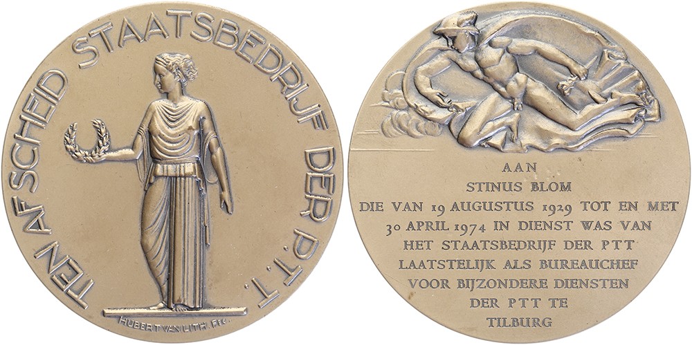 (1941) Personeelspenning P.T.T. Staande vrouw in antieke kledij met lauwerkrans. / Inscriptieruimte onder vliegende Mercurius. Op naam van: STINUS BLOM, TILBURG, 1929-1974. Æ 60. H. van Lith. In origineel doosje ’s Rijks Munt. Prachtig / FDC.