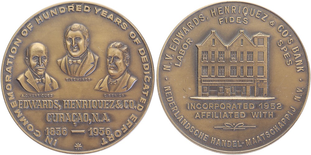 1956 Curaçao. Eeuwfeest N.V. Edwards, Henriquez & Co. Drie borstbeelden boven drieregelig opschrift. / Bankgebouw te Willemstad. Æ 74,5. Prachtig. N.B. In 1968 overgenomen door de ABN.