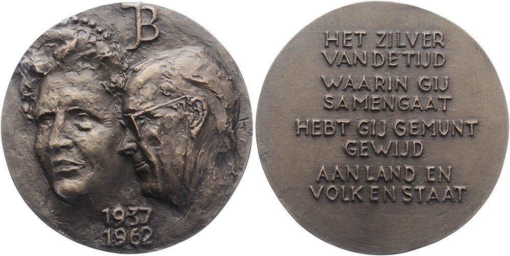 1962 Zilveren huwelijk Juliana & Bernhard. Dubbelportret boven jubileumdata en onder ligatuur JB. / Achtregelig opschrift. Æ gegoten 105,8. KB VI-2704a. A. Termote. Prachtig.
