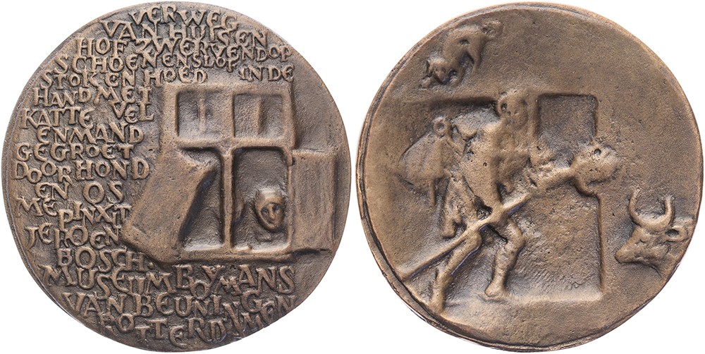 (1969) Rotterdam. Museum Boymans-Van Beuningen; ‘De Verloren Zoon’ van Jeroen Bosch. Kozijn met luiken; iemand kijkt uit het raam. / Zwerver met bedelstaf; hond en ossenkop. Æ gegoten 62. Beeldenaar 2002, pag. 21, nr. 64. (Eric Claus). Prachtig.