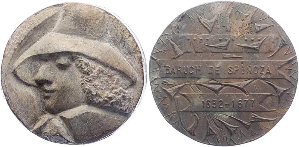 (1977) Baruch de Spinoza 1677-1977. Portret Spinoza met hoed naar links. / Drie banden met opschrift. Æ gegoten 101. Beeldenaar 1983, pag. 117-120. Th. van der Nahmer. Voorzijde zwaar gepatineerd. Zeer fraai.