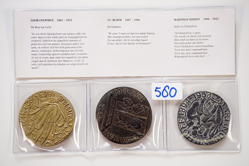 Lot (3) 1977 Restauratie huis Haagsche Kunstkring. Drie gietpenningen met J.C. Bloem, Louis Couperus en Mart. Nijhoff. Æ gegoten ± 67. (Frank Letterie). In originele folder. Prachtig.