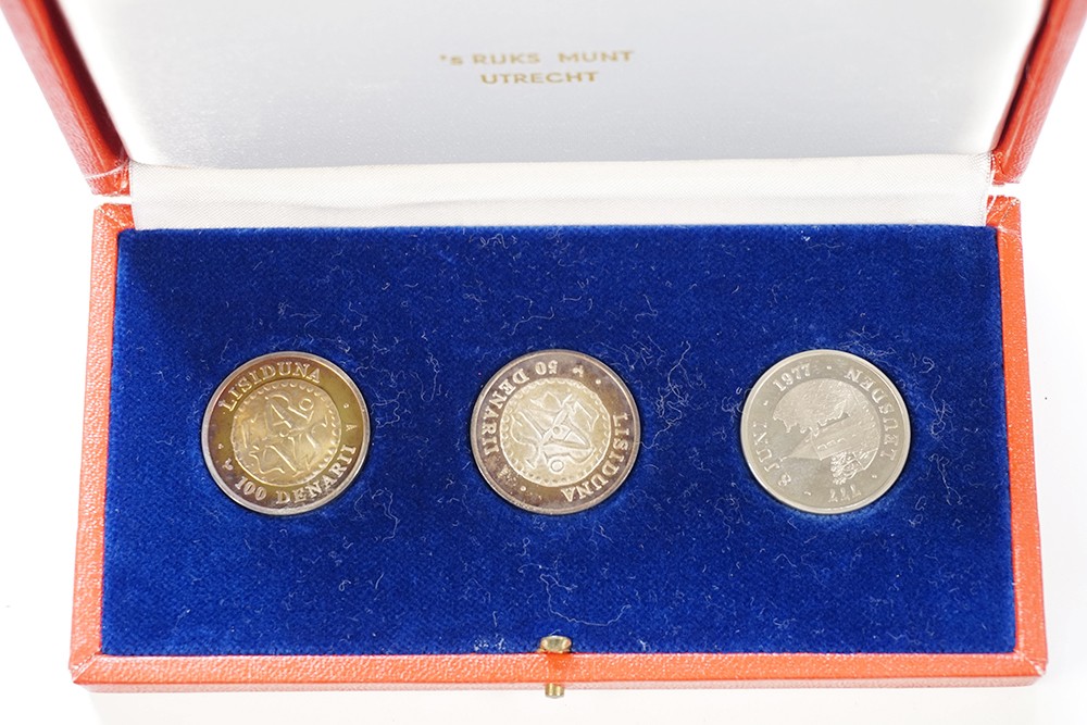 1977 Leusden 1200 jaar. Set van drie (kopernikkel, zilver en goud) 10-50-100 Denarii in proof. De Kreuk/Mev. 102A, 103A, 104A. In origineel doosje ’s Rijks Munt.